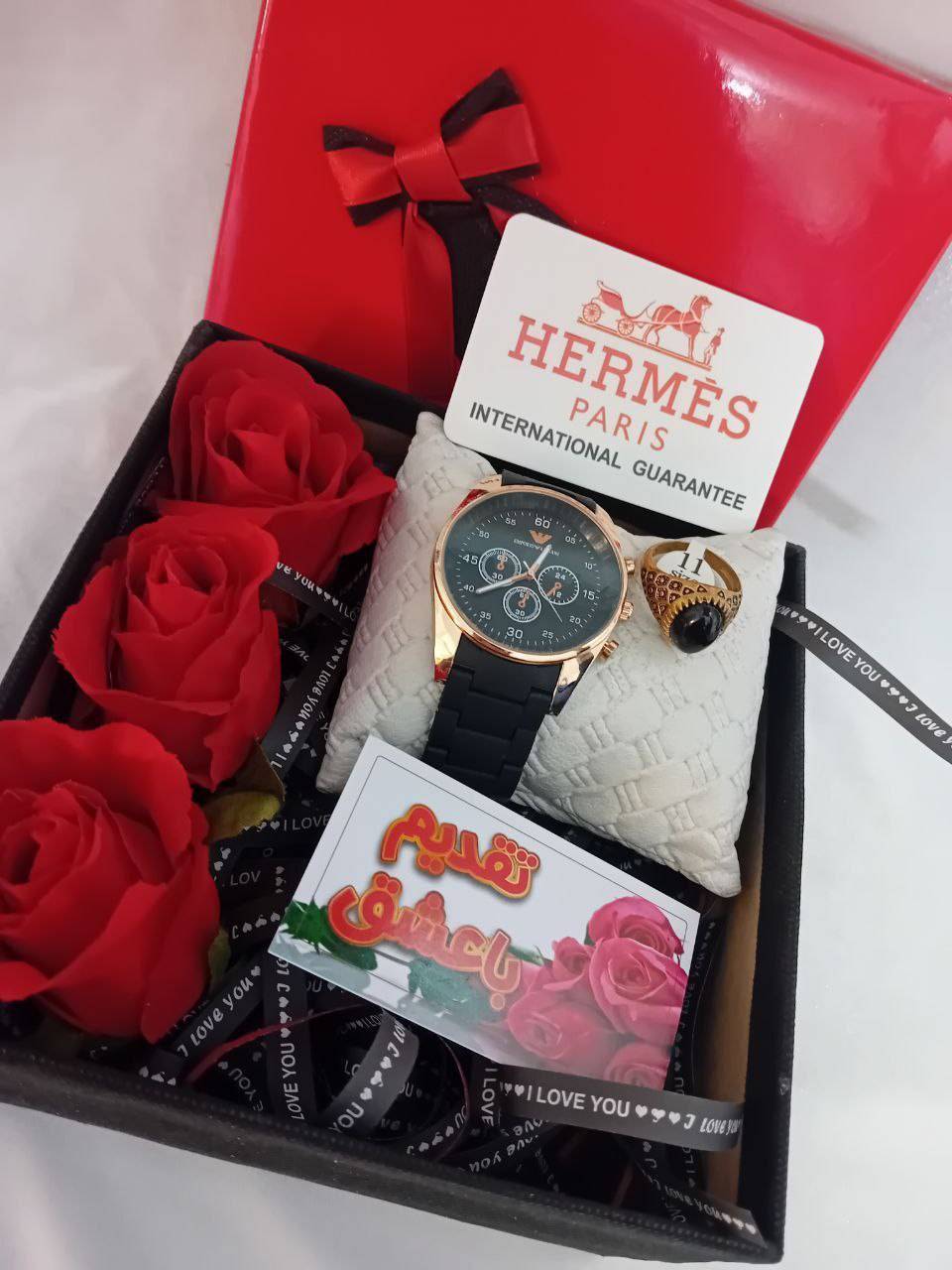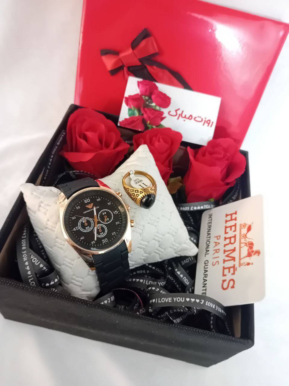ساعت مردانه امپریو آرمانی مشکی قاب رزگلد همراه با انگشتر